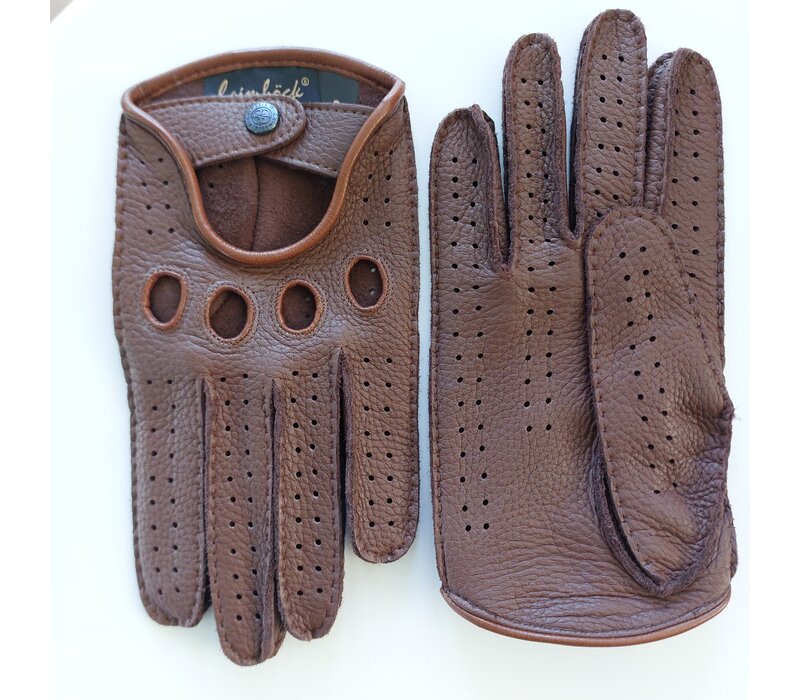 Handgefertigte Herren Autofahrerhandschuhe, Modell Buxton, aus hochwertigem exklusivem Elch Leder aus Finnland. Das Leder dieses Laimböck-Modells ist sehr weich und robust. Diese Autohandschuhe für Herren sind ungefüttert und haben durch das natürliche Relief des Leders eine robuste Optik. Die Innenseite des Handschuhs bietet einen perfekten und sicheren Halt. Die offenen Knöchel sind stilvoll mit Leder eingefasst. Zusammen mit der Perforation an Ober- und Innenhand sorgt dies für eine hervorragende Atmungsaktivität beim Fahren. Der klassische Laimböck Druckknopfverschluss am Lederband rundet dieses Produkt ab.