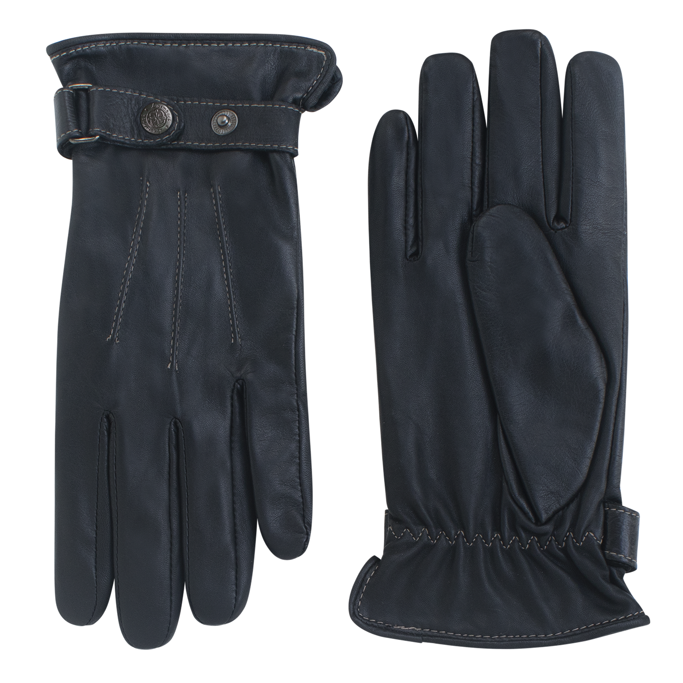 Gefütterte sportliche Freizeit-Lederhandschuhe für Herren mit 3 markanten Kontrastnähten, Modell Salisbury aus hochwertigem Lammnappa. Diese schwarzen Herrenhandschuhe haben einen Gummizug in der Handfläche, der gut vor Kälte schützt. Der Bund ist mit Leder eingefasst und hat einen Seitenschlitz für einfaches Anziehen der Handschuhe. Dieses Laimböck-Modell hat durch das Lederband mit verstellbaren Laimböck-Druckknöpfen einen lässigen Look.